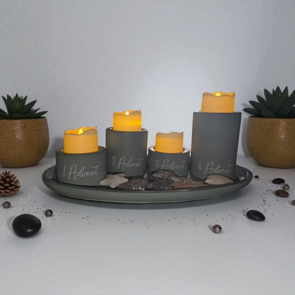 Der etwas andere Adventskranz, Platte, 22 x 13 cm, mit 4 Kerzenständern für Teelichter in den Größen 3 x 5 cm, 4 x 5 cm, 5 x 5.5 cm und 5 x 7.5 cm in grün.